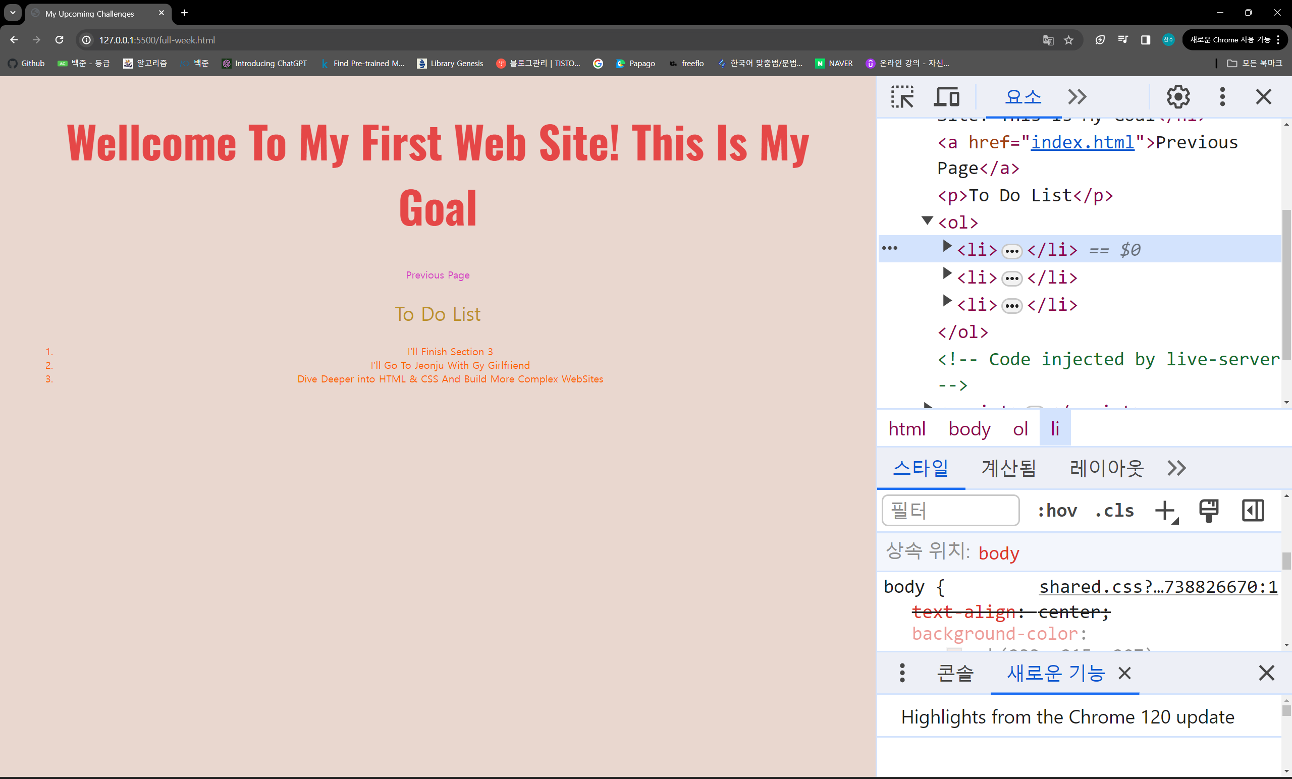 작성한 코드중 가장 하위 요소인 <li>를 살펴보면 상속 위치라고 표시 된 요소가 body, ol 두개이다.